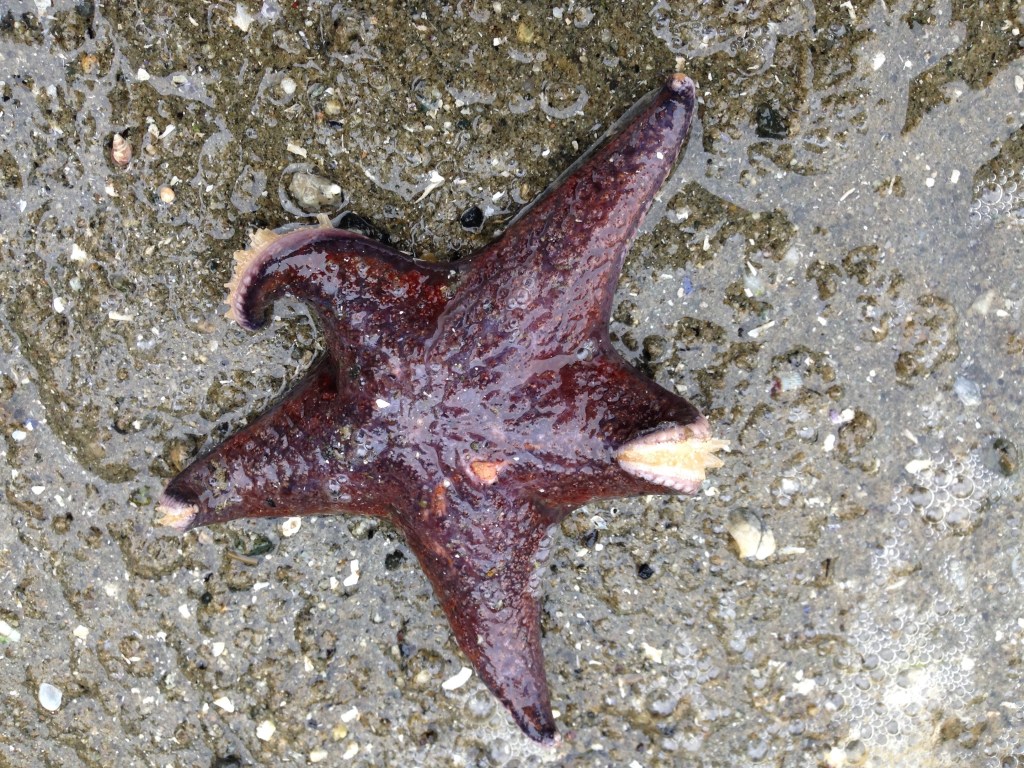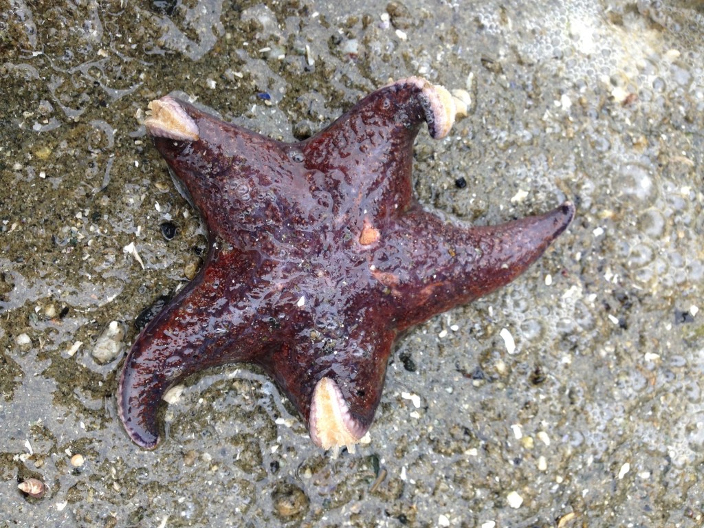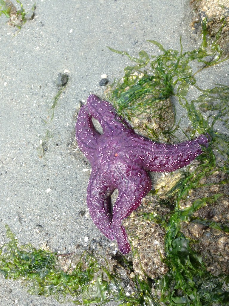 It is late afternoon and tide has now gone out far enough to be able to see a whole other world of lively sea creatures. Teeny tiny crabs and dark coloured clams, muscle-y mussels, rough shelled oysters and tenacious barnacles appear here, there and everywhere. Hidden within rocks and boulders are massive clusters of violet sea stars all nestled tightly in what looks like an intimate family gathering. Feasting fully in the moment, they snuggle closely together in the great peace and calmness of their ocean sanctuary.