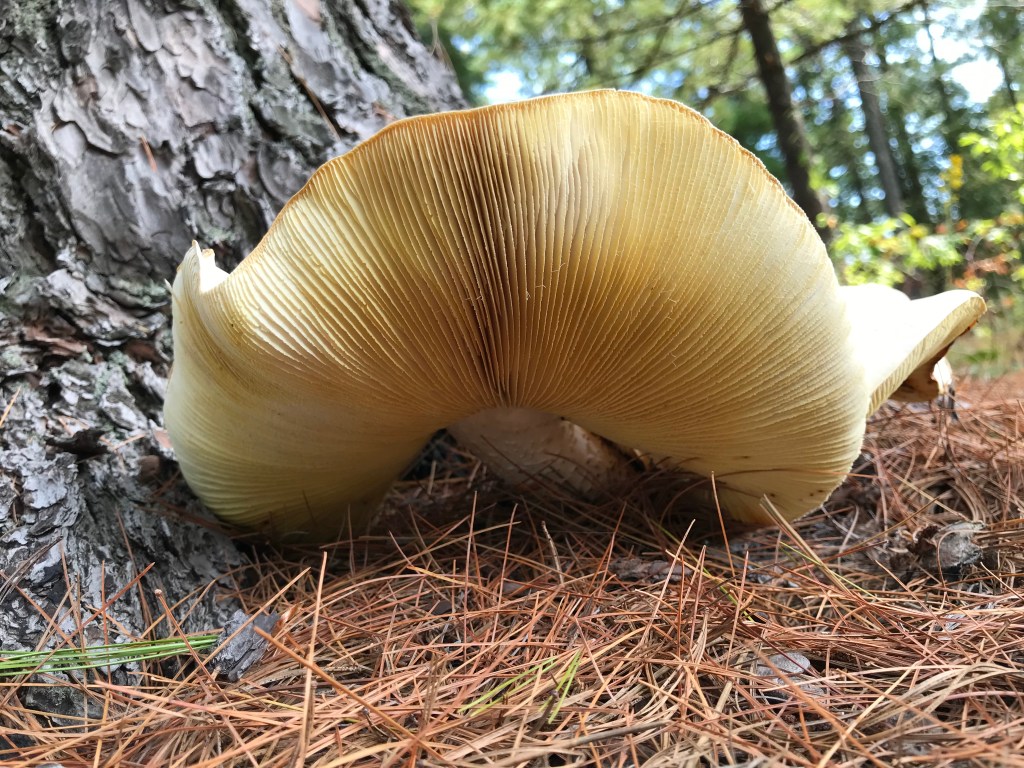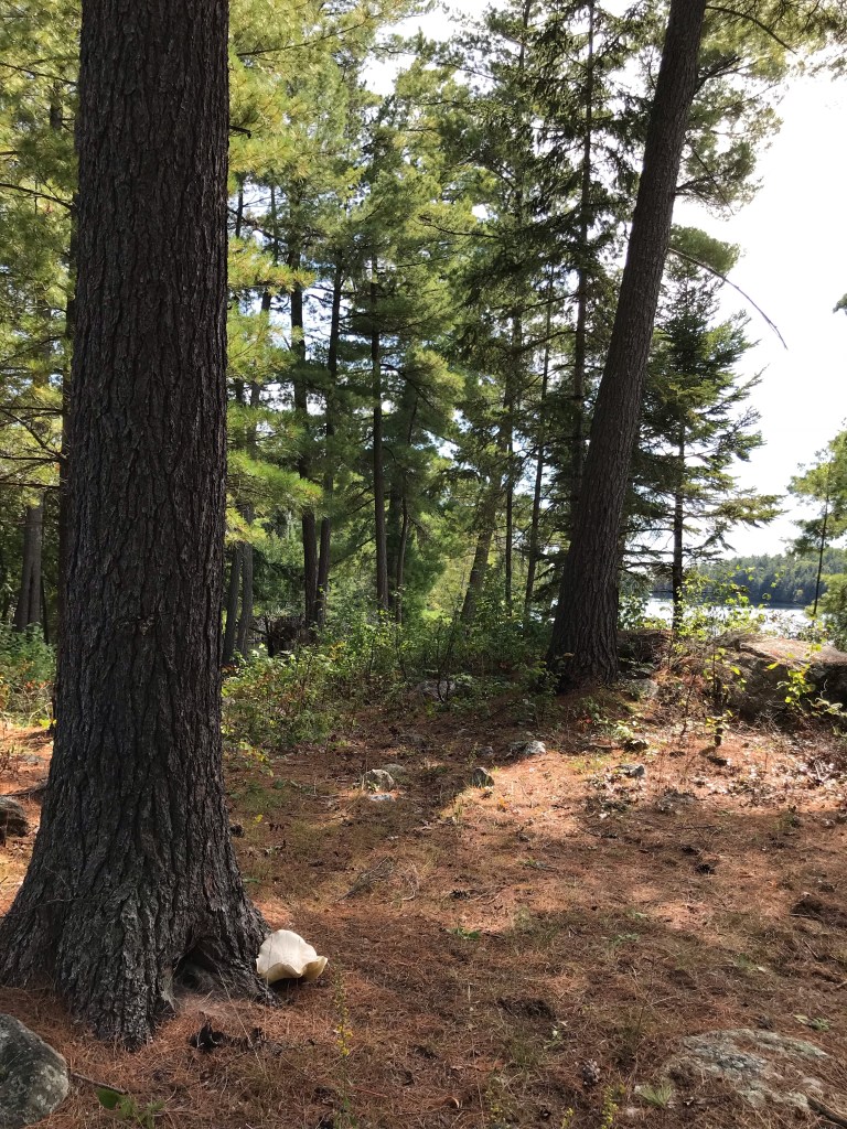 With summer coming to an end and fall about to fall in place, there is little visible on land confirming this on a small remote island in the midst of a Y-shaped lake. “Why … oh why??!” one might ask! It is apparent that all life here continually thrives regardless dramatic weather changes throughout seasons. One remarkable species, a large shiny pearl-coloured mushroom verifies this in miraculous ways!