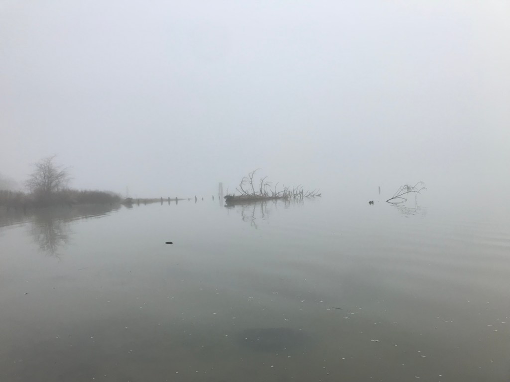 On a fog ridden day, along a long winding slough, earth and sky unite as one with nothing visible between water, land and air. As the horizon has vanished, the mysteries of life unfoldings carries energies of peaceful acceptance of all that is in the environment. What is usually visible is now absolutely invisible except for one area where a broken tree filled with bare branches floats on the water and a small piece of land is visible. Scanning the misty view expands our periphery from differences to no differences at all!