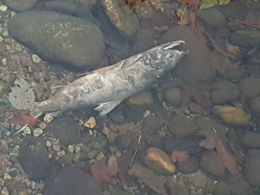 Even as most fish head upstream, a few swim sideways and rotate, or even turn downstream periodically. One very large silver-toned fish lays diagonally still with right side facing down, under water and left facing up, carrying happy expressiveness in its facial features. The glow in its body reflects the sun energies yielding magical powers, strength and stability in journey of life. Even though this one may be at end of life, its expression reveals a whole other level of beingness!