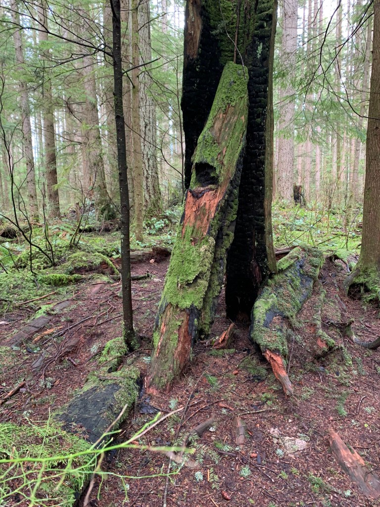 Deep in a forest, where a variety of trees cover the earth, one tree that was burnt long ago broke apart from an apparent fire. One of its’ smaller broken sections is somehow still standing as it leans into larger one that is firmly rooted into the ground. With the little ones’ rotting bark and lots of moss growing overtop, a sizeable hole shaped like an open mouth with lip and tongue hanging out, the darkness surrounding it does not impede its life energy..